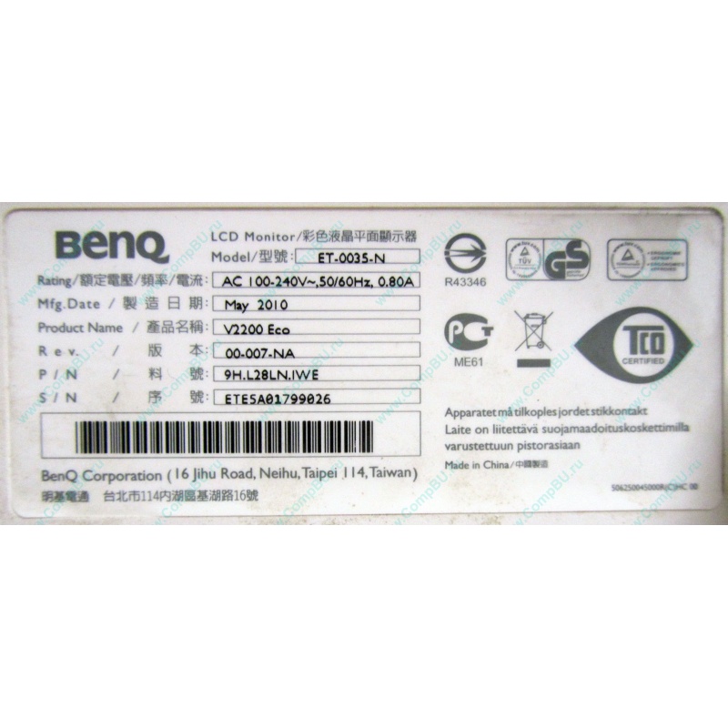 21.5" Benq LCD Monitor ET-0035-N V2200 Eco Rev 00-007-NA 9H.L28LN.IWE